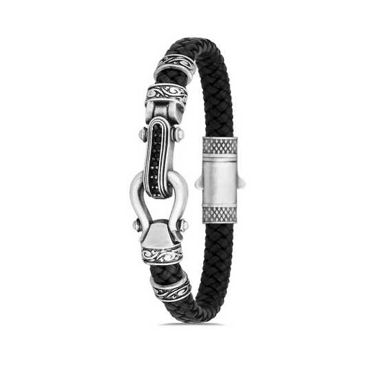 Zirkon Taş İşlemeli Siyah Deri Gri Bileklik