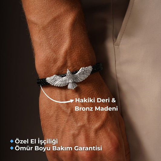 Kartal Figürlü Zirkon Taşlı Hakiki Deri Erkek Bileklik