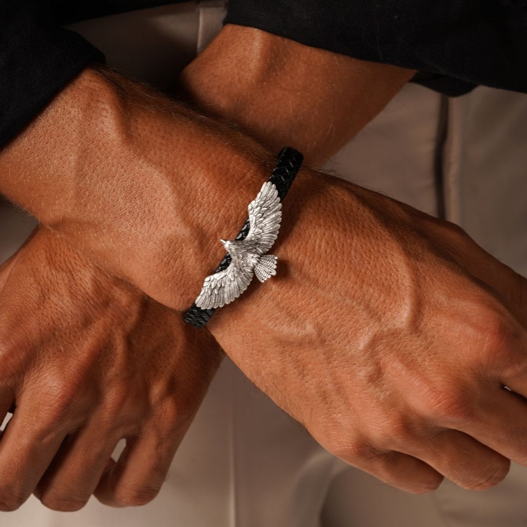 Gri Kartal Figürlü Siyah Deri Bileklik