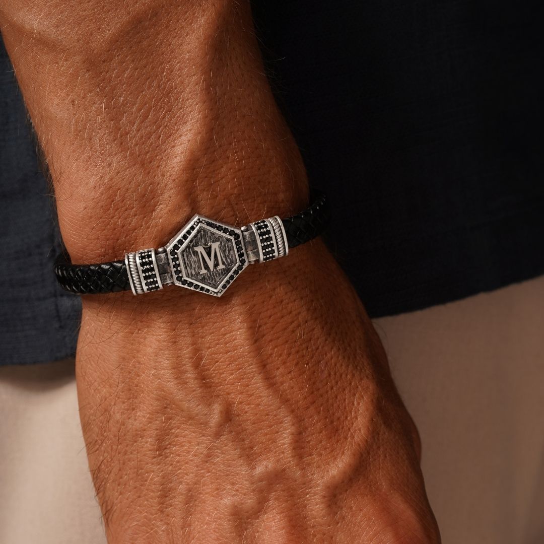 Kişiselleştirilebilir Altıgen Hakiki Siyah Deri Erkek Bileklik